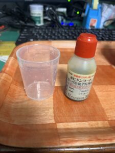 左のハチミツボトルみたいなものがイソジンの薄め液です。