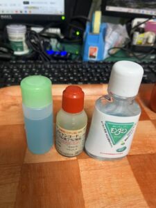 左端の青キャップのボトルもモンダミンから入れ直したものです。持ち運び易さを追求して探せば100円均一でも売っているので探しましょう。モンダミンは原液で使うのでイソジンに比べると少し割高になるでしょう。